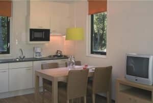 De bungalow is gelijkvloers en is goed en gemoedelijk ingericht. De woonkamer heeft een zit-en eethoek. Er is veel licht in de woonkamer, dus je geniet van de natuur en ruimte om de bungalow. Er is een tv en wifi.